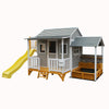 Included Mud Kitchen underneath: cupboards, sink with tap (suitable to connect to water hose), and stove top