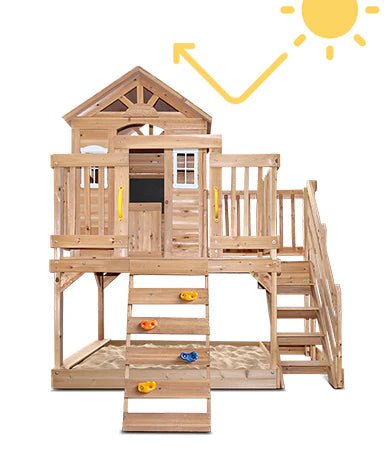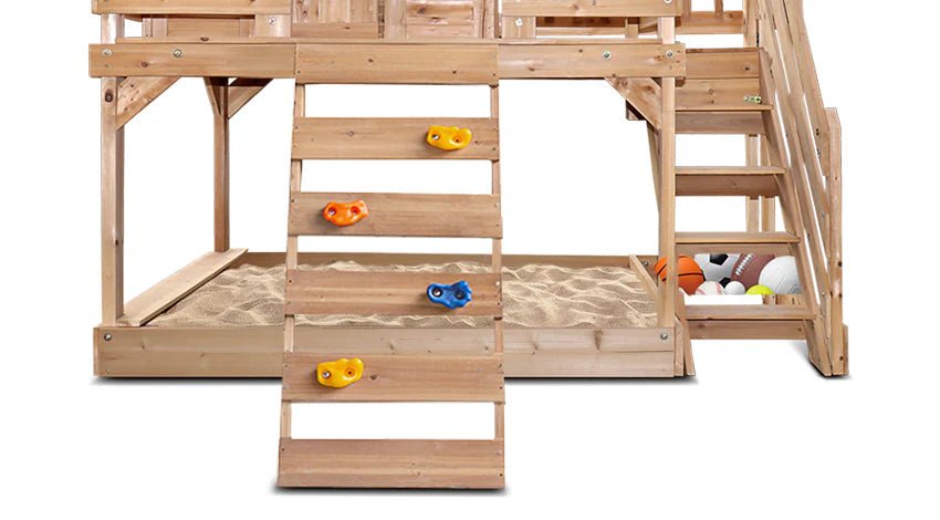Every kid's cubby is their castle, and there's plenty to love about the Silverton Cubby House with Rock Climbing Wall. With adequate space to play in the elevated play area, the Silverton will keep your kids and their friends occupied in their own space. Heaps of ways to play and learn with an in-built play kitchen, sandpit and fun rocking climbing wall.